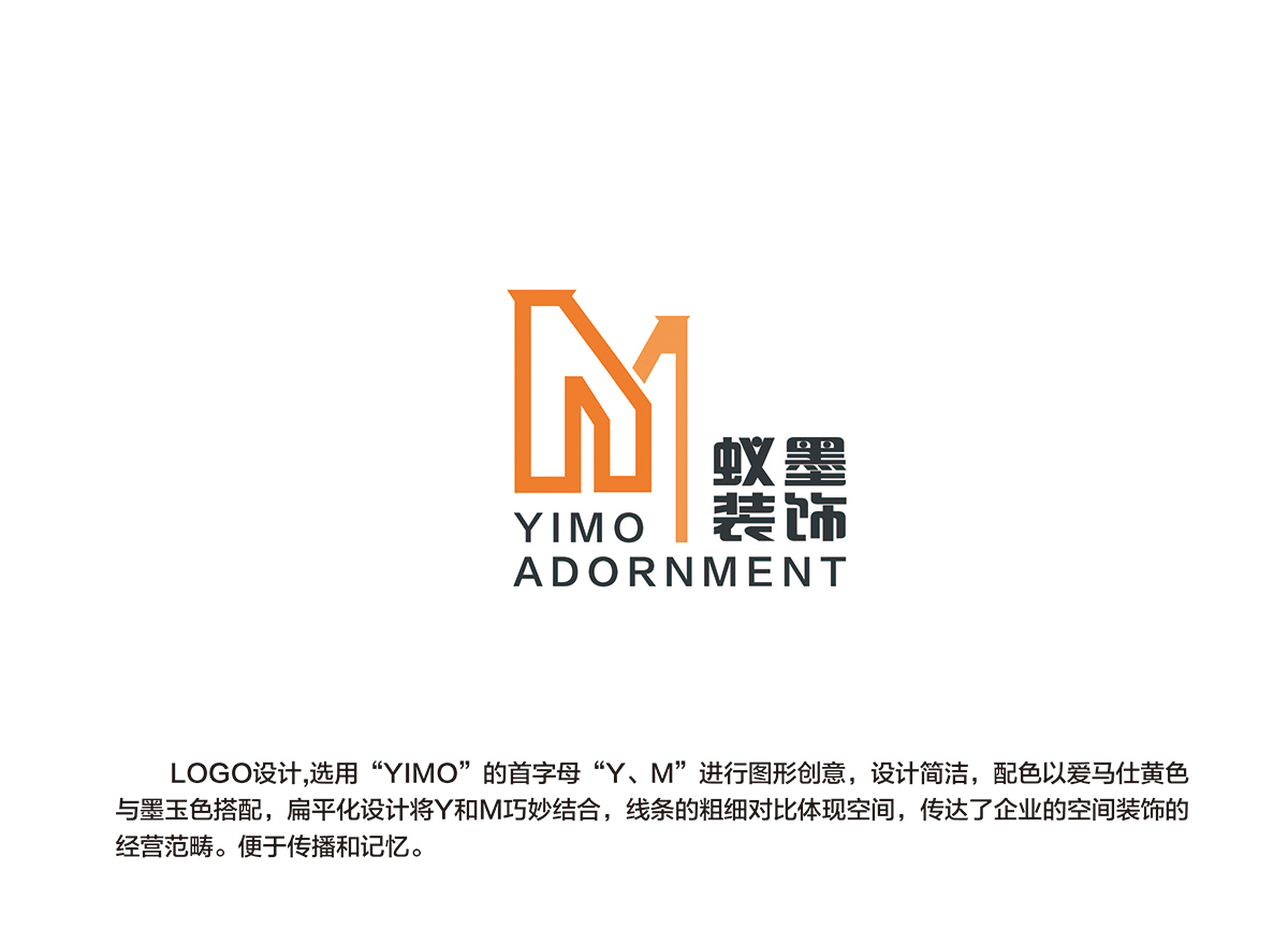 創(chuàng)意思路: 蟻墨裝飾LOGO設(shè)計(jì)選用“YIMO”的首字母“Y、M”進(jìn)行圖形創(chuàng)意,設(shè)計(jì)簡潔,配色以愛馬仕黃色與墨玉色搭配,扁平化設(shè)計(jì)將Y和M巧妙結(jié)合,線條的粗細(xì)對比體現(xiàn)空間,傳達(dá)了企業(yè)的空間裝飾的經(jīng)營范疇。便于傳播和記憶。