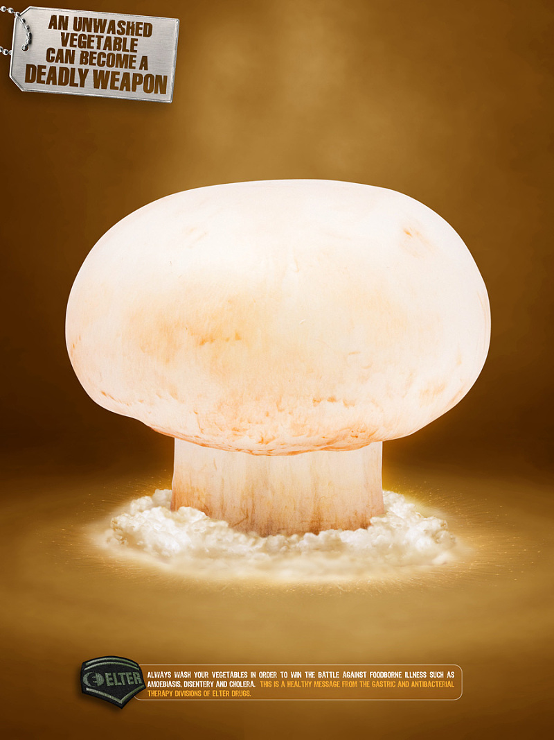 這個廣告通過把一個未洗的洋薊比喻成炸彈來警告公眾食源性疾病的危害。 通過創建一個視覺比喻,Elter藥業公司能夠傳達有關食品安全和Elter藥物自己的抗菌治療部門的強烈信息,而不顯示任何敏感的圖像。