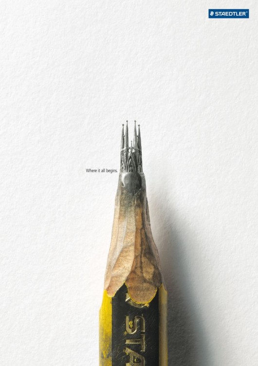 看看Staedtler文具公司的這則廣告。 其中顯著體現了比例縮放的原則——首先,鉛筆已經放大了很多,但重點仍然在被雕刻成精美大教堂的筆尖上。使用大幅度的比例縮放不僅能夠吸引觀眾看得更仔細,而且還強化了“大始于小”的概念。