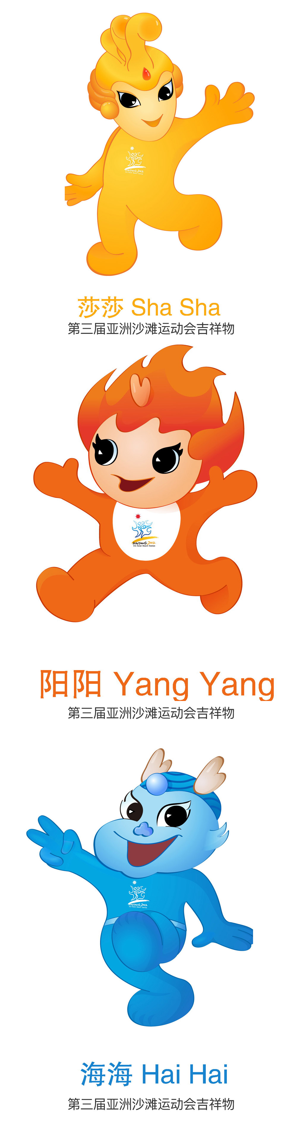不過2012年的吉祥物就有點喜歡不起來了。據當時的介紹,吉祥物的主創團隊來自清華美院,這三卡通人物形象以「龍」、「太陽」、「鳳」為原型,分別代表海水、陽光、沙灘。