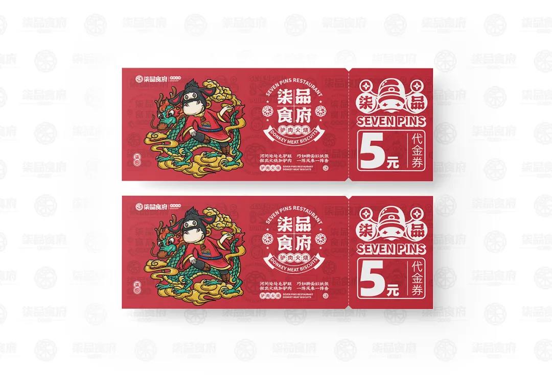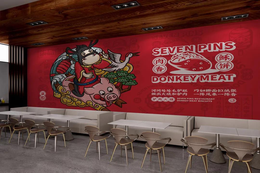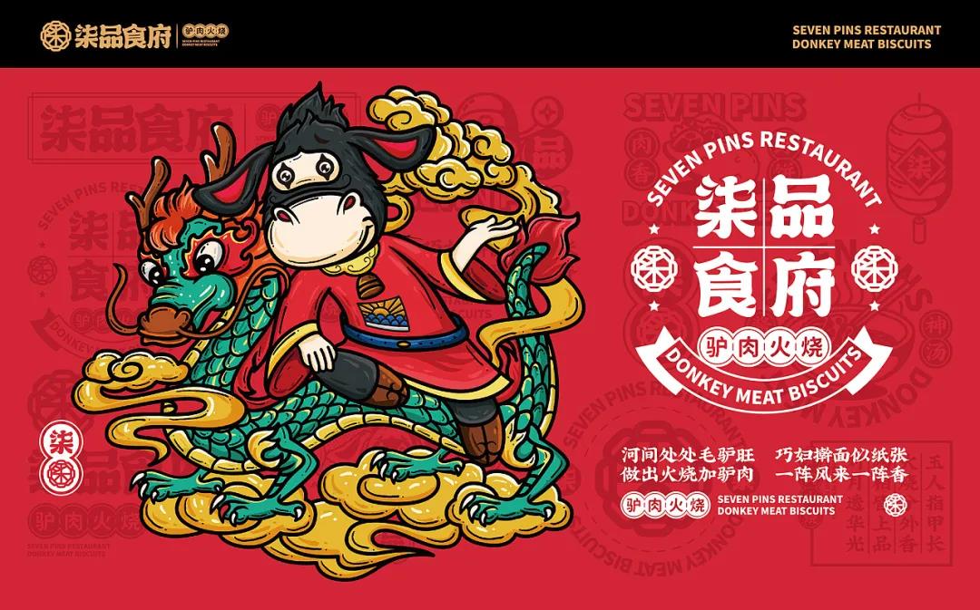 品牌根據(jù)品類塑造了一個(gè)驢IP,擬人化處理后的驢IP,形態(tài)更接近Q版,兩只驢耳朵向外伸展,隨著表情動(dòng)作向上或向下伸展,很是靈動(dòng)。傳統(tǒng)服飾在身,對(duì)驢肉火燒的歷史悠久進(jìn)行不經(jīng)意的刻畫。驢IP拿著不同的東西做出不同的動(dòng)作時(shí),形象就變得年輕起來了,十分有趣。驢IP與青龍、鯉魚、嫩豬以及小雞等具有中式代表性的動(dòng)物進(jìn)行搭配,創(chuàng)作出一幅幅國潮風(fēng)插畫,是對(duì)美好寓意的向往和憧憬,也突出品牌的包容性和多樣性特點(diǎn)。品牌的輔助圖形就比較常見了,從標(biāo)志和IP中延展,與文案和簡筆食材、菜品結(jié)合,以此更好的宣傳柒品食府這個(gè)品牌。