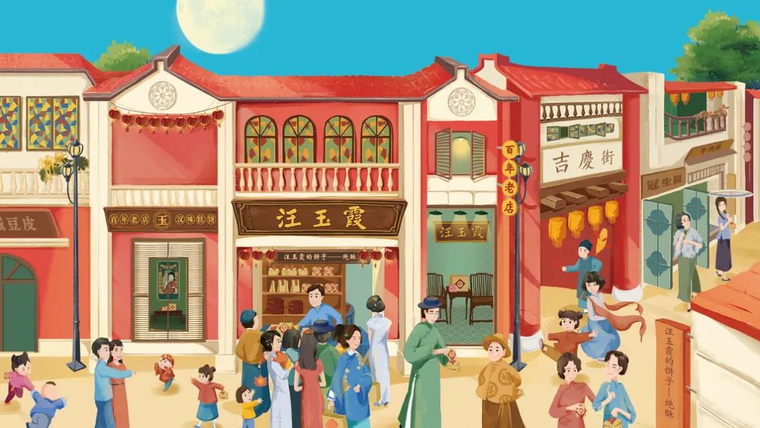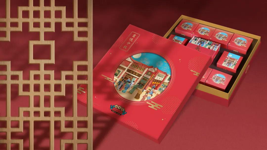 這款中秋禮盒包裝,首先外觀插畫采用了明快、簡潔的風(fēng)格,描繪民國時(shí)期的商業(yè)街、小洋樓、,紅墻坡頂、雕花欄柱及彩繪玻璃等元素,再現(xiàn)那個(gè)時(shí)代的繁華景象。