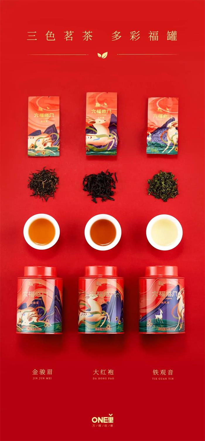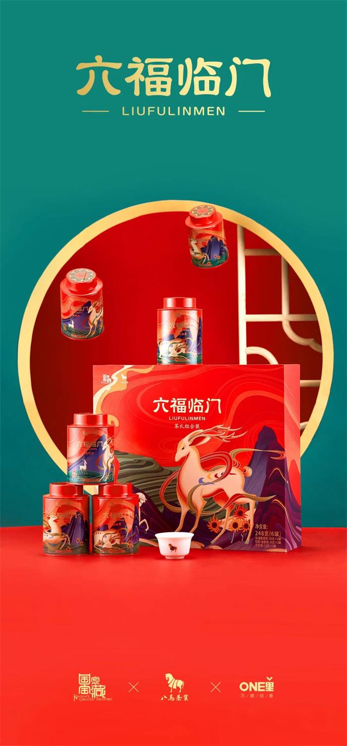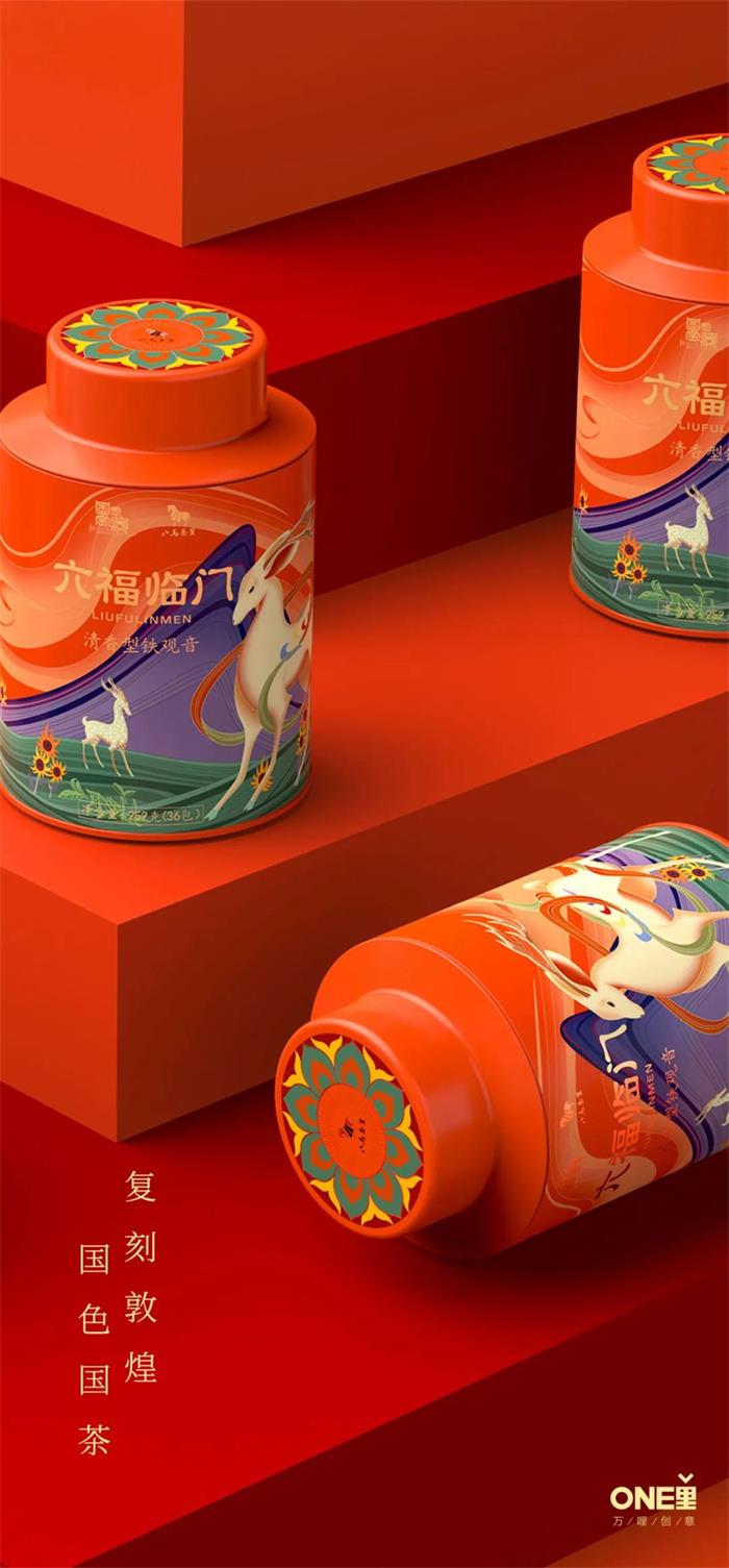 首先來看國家寶藏與八馬茶業聯名打造的“六福臨門”定制款禮盒,包裝采用中國傳統色彩搭配,并巧妙復刻了敦煌《鹿王本生圖》IP形象,營造國色茶香般的品質感。暖橘色的多彩福罐包裝,細膩的線描插畫勾勒了起伏的茶園山脈,對敦煌壁畫主體起到分割畫面的作用,同時烘托了整體氛圍,更符合現代的審美需求及習慣。畫面的主角--九色鹿及俊馬形象,其造型輪廓俊呈現瀟灑飄揚、豪放自由姿態,并以現代插畫處理方式再設計,意在突出敦煌壁畫風格。