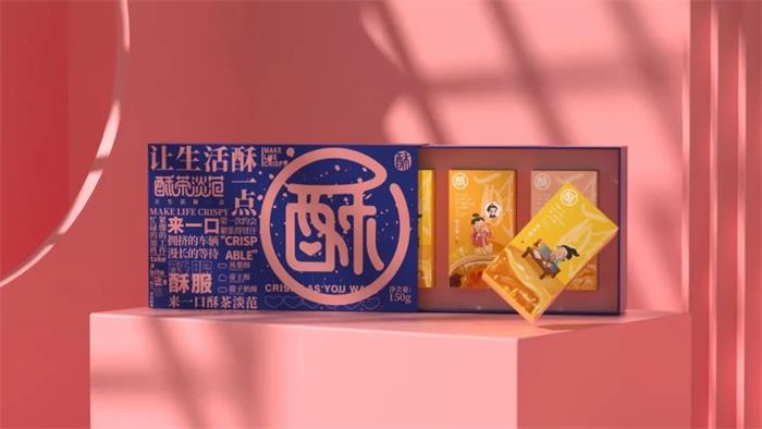 首先這款酥餅類食品,產品名靈感來源于“粗茶淡飯”,希望我們能通過一口酥餅、一碗茶,感受生活的寧靜與美好,進而建立消費者與品牌間的情感連接。LOGO上,采取了雙重的視覺效果,簡單圓形包圍著“酥”字,言簡意賅地表明了產品屬性,搭配完整的品牌名進一步提高辨識度。選擇飄逸感較強的筆觸表達字體,打造一種隨和、清新的感覺,“酥”字還將筆畫換成了粉色心形圖案,豐富視覺畫面的同時,給消費者一種甜到“酥”的感覺。禮盒分為紅、藍兩款主色調包裝,圖形化的“酥”字占據了大部分封面,柔軟的筆觸與裸粉色調形成品牌的視覺符號。左側則是滿版的產品賣點排版,重點突出“酥服”等俏皮文案,進一步強化品牌調性,以直戳消費者痛點的文字表達激發其購買欲。抽拉式禮盒便捷易開,加之透明內封的裝飾保護,賦予包裝更多的收藏和送禮價值,內盒獨立包裝將畫面定格在古代,古裝小人IP正在認真工作、乘轎外出或品嘗美食,并且將手繪插圖的蛋黃酥為“背景板”,寓意沉浸在美食的世界~