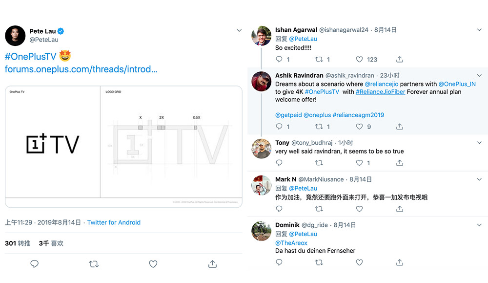 8月14日,一加創(chuàng)始人、CEO劉作虎在Twitter上發(fā)布了一加即將推出的電視品牌名稱“OnePlus TV”以及全新的LOGO設(shè)計(jì)。