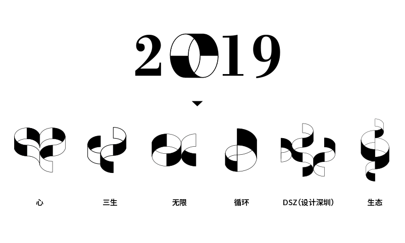 主視覺設計借用“可持續”的概念,從設計元素的可持續出發,從年份“2019”中提取“0”,設計了一套專屬字體,并在字體的基礎上設計了一組圖標,代表著不同的寓意。
