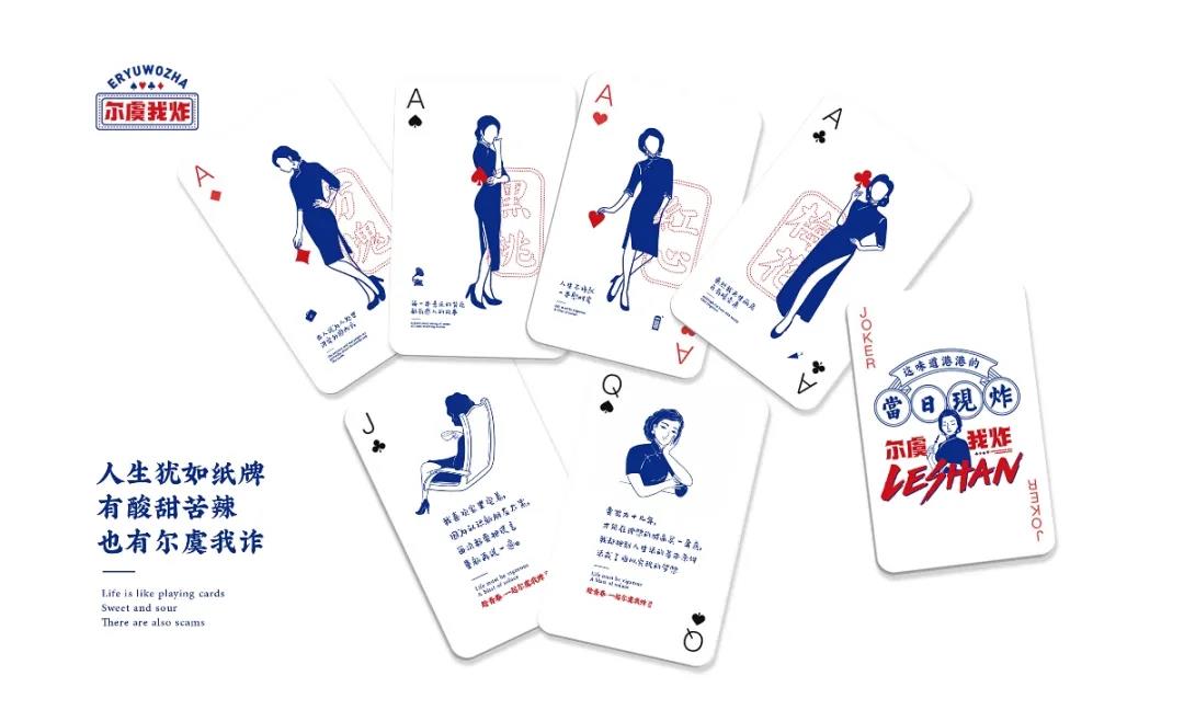 品牌名字叫“爾虞我炸”,靈感來源于對社會主觀的想法,人生總是會遇到一些爾虞我詐的現象,視覺上用這個創意切合到品牌風格上。提取“我炸”,是撲克牌上一種的牌型,融入穿著旗袍嫵媚的女性人物,展示出對社會看透一切心態的文案,只要趁青春,一起爾虞我詐的撲克理論。人生猶如紙牌,有酸甜苦辣,也有爾虞我詐。通過一些段子的文字,讓這個品牌的IP人物更豐富,有血有肉的塑造與消費者拉近距離。輔助圖形是撲克牌的花色,外加一些幾何圖形、線條來修飾,紅藍色搭配很復古、醒目。