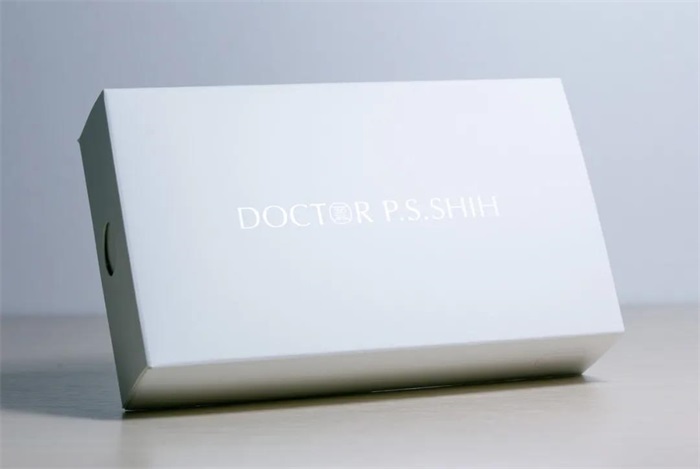 此次形象設計決定擺脫牙醫常見的牙齒形狀作為素材。Dr. Shih活躍于國內外的牙醫活動,期許以東方文化的特色融入個人的形象,以跟西方講者們的形象做出明顯區隔。以Dr. Shih 名字中極具東方意象的“圣”字為基礎作為設計元素,將“圣”字的筆畫結合能夠代表東方廟宇的飛檐,保留“圣”字堆疊的橫筆呈現嚴謹的規矩,外圈的白框則象征著臼齒俯瞰的形狀。除了特色以外,也考慮到極小的應用尺寸,就算雕刻在小面積的牙材上也可以有很好的識別性。包裝外盒部分使用全白的方式搭配燙珍珠膜,呈現潔白干凈的牙齒也能夠代表醫師明亮的形象,內盒則規劃了實用的收納空間,也大器呈現客制的不銹鋼牙材盒,展現脫俗的個人品味。