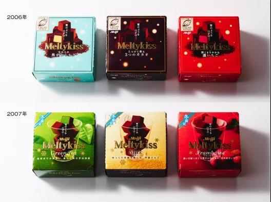 2006-2007年階段,雪吻巧克力包裝設計上的改變主要體現在巧克力的擺放布局上。由之前的兩顆“依偎”換為多顆疊放,形成一種層次感和趣味性。2007年的包裝上,巧克力被放在了一個透明的玻璃杯中,據小川裕子介紹,雪吻巧克力是精致的小方塊造型,一般用手去抓取放在口中。把巧克力放在杯中,方便人們輕松拿起。所以這個設計是為了傳達吃巧克力時的享受感,在家里一顆一顆地吃,感受生活的甜蜜。