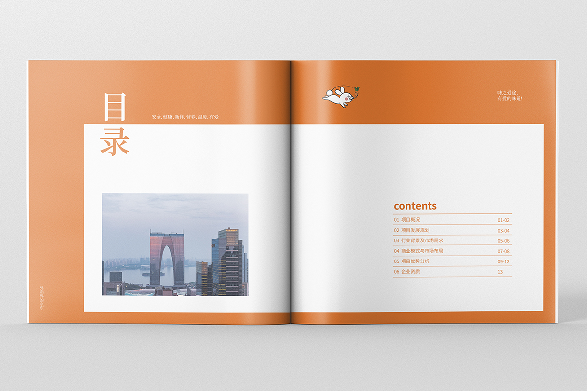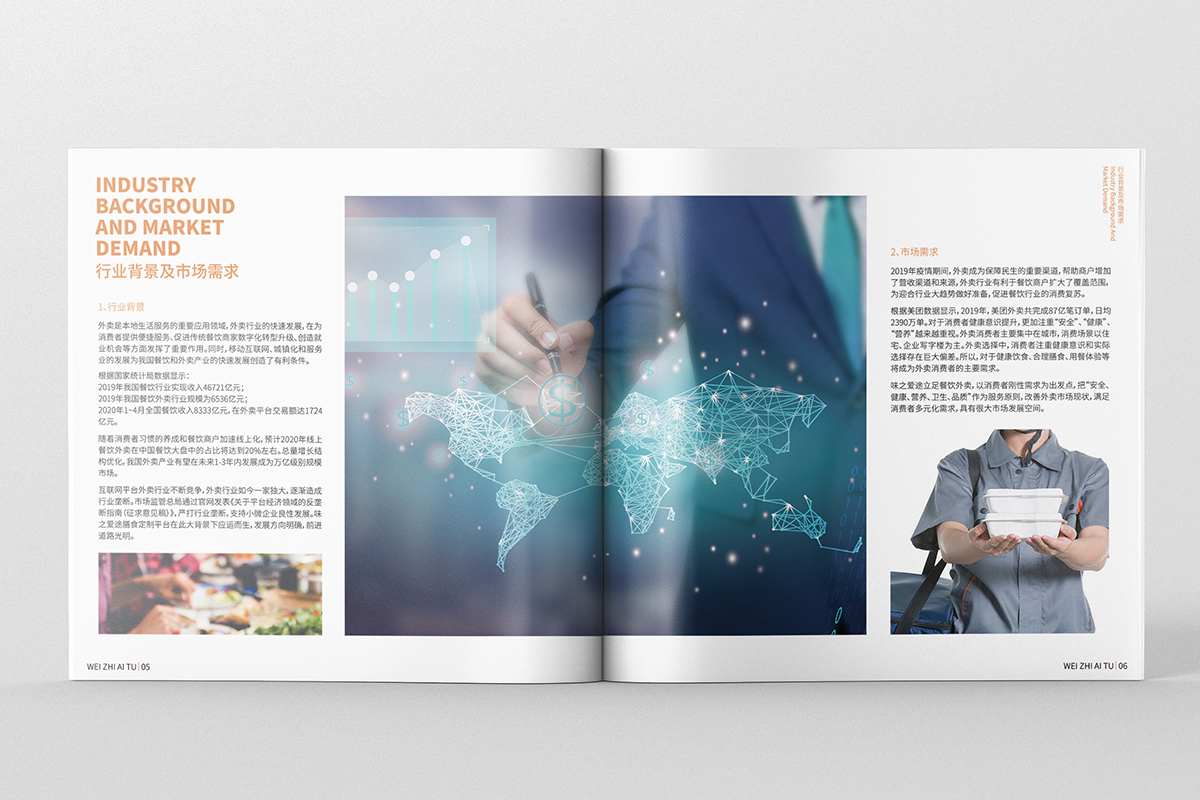 本案例是為餐飲平臺的招商宣傳冊設(shè)計。品牌理念主打“安全、健康、新鮮、營養(yǎng)、溫暖、有愛”品牌餐廳家常菜系,提前預(yù)定,當(dāng)天制作,保證足量與菜品新鮮,突破地域限制,以創(chuàng)業(yè)園、寫字樓等為集中消費區(qū),實現(xiàn)全城專屬定向配送,解決消費者午、晚健康營養(yǎng)的兩餐問題,同時把愛與溫暖送給為理想奮斗的人們。所以在畫冊宣傳中,不需要華麗、復(fù)雜的設(shè)計,只需要將產(chǎn)品圖片很好地表現(xiàn)出來,所謂眼見為實,讓人們能看到實物圖片,是最具有說服力的設(shè)計。